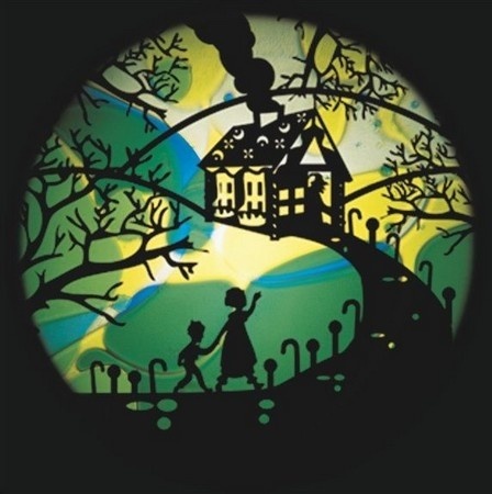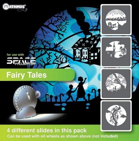 - 4 diapositives avec des motifs en noir et blanc de "Contes de fées": l'image projetée sur le mur ou le plafond est statique mais, en la combinant avec une roue à huile (celle livrée d'origine avec le projecteur ou bien l'une de celles des packs optionnels Réf. : 181008 et 181009), l'effet visuel des mouvements de lave en image de fond rend la projection plus vivante.