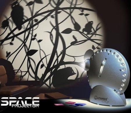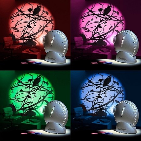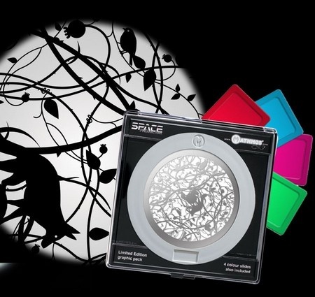 - 2 roues graphiques "Espace" et "Faune": chaque disque représentant un dessin en noir et blanc tourne en continu et projette une image en rotation sur le mur ou le plafond; on peut y ajouter une des 4 diapositives de couleur fournies pour faire varier l'ambiance.