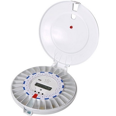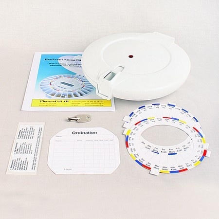 Appareil robuste muni d’un verrouillage à clé. • Panier doté de compartiments à médicaments que l‘aidant remplit à l'avance. • Peut délivrer 28 fois des médicaments jusqu’au prochain remplissage. • A l’heure programmée pour la délivrance des médicaments, un signal sonore retentit et un témoin lumineux clignote. • La dose de médicaments est obtenue par le patient en retournant le pilulier.• Les autres médicaments placés dans le pilulier demeurent invisibles et inaccessibles : aucun risque de surdosage. • Piles (fournies) assurant le fonctionnement pendant un an.