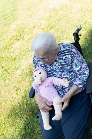 Avec son postérieur lesté, Lilly se positionne dans les bras de la personne âgée comme un vrai nouveau-né. Elle la regarde avec de grands yeux et semble écouter attentivement.